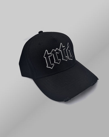 Our distressed black cap with an adjustable strap and our Gothic logo in black & white