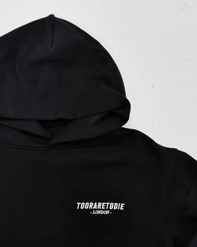 Our oversized fit, black hoodie with our TOORARETODIE London logo on the front and legacy design embroidered at the back.