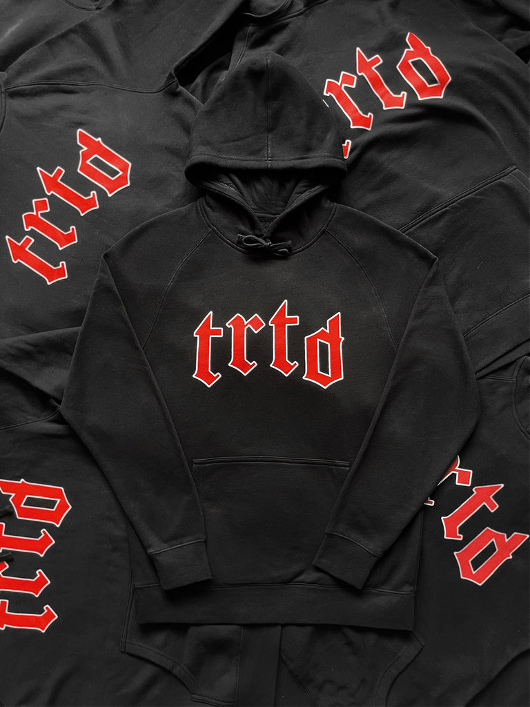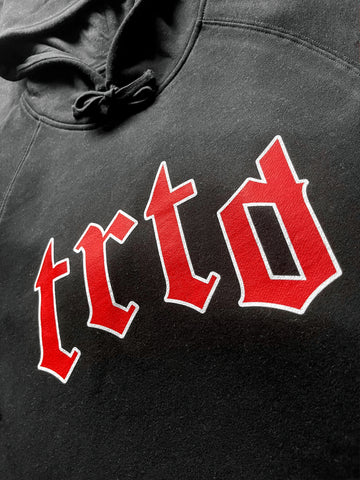Our relaxed fit, black hoodie with our Gothic TRTD logo across the chest panel in red