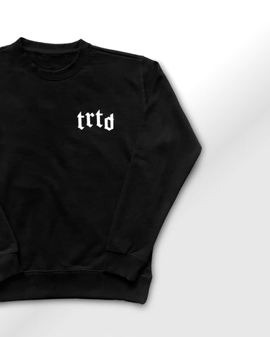 Black, relaxed fit crewneck with graphic design printed large across the back